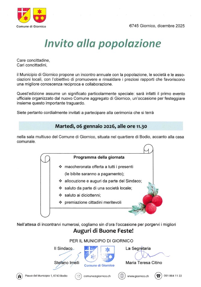 Esso si terrà Martedì 6 gennaio 2026, ore 11.30, presso la Sala multiuso del Comune di Giornico (quartiere di Bodio, accanto alla casa comunale).